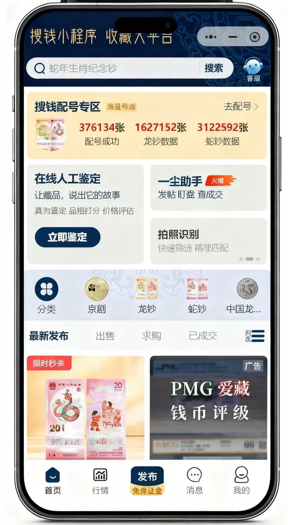 平台不仅提供交易保障服务,还为用户提供藏品交易信息免费发布、AI智能估价、在线人工鉴定、钱币藏品配号、搜钱一尘盯盘助手等多元化服务。